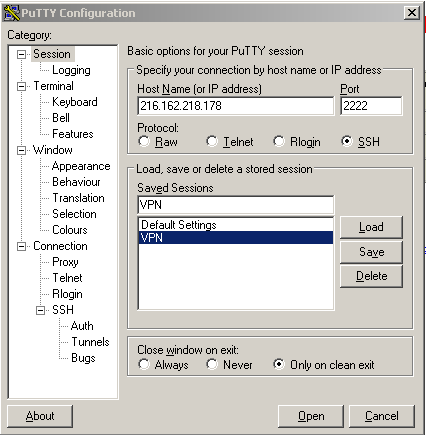Press the Save button and save the connection information. In the future you should be able to open PuTTY, highlight the saved information and press the Load button, and then Open a session.